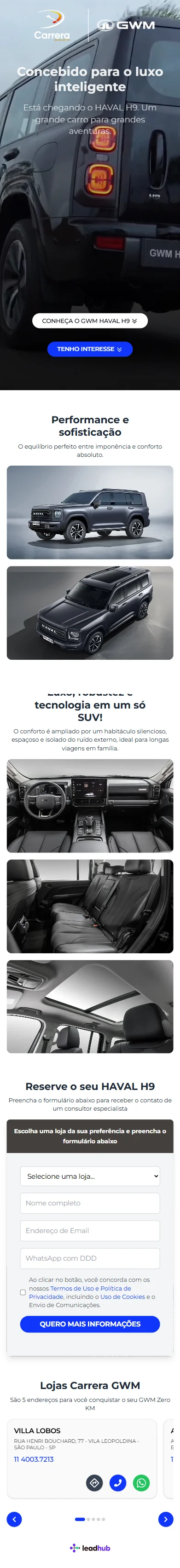 Já em produção com 65+ landing pages ativas por grupos automotivos brasileiros. Integrado nativamente com o ecossistema LeadHub.